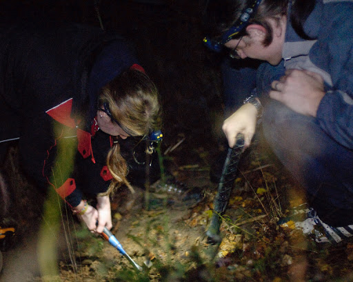 Покопав немного, решили покушать и вообще погреться у костра (ночью-то холодно). Тут выяснилось, что свежекупленная цепная пила — говно (постоянно разрывалась на две части, каждый раз в новом месте). В итоге после десятка перековок напилили дров на костёр и замечательно возле него посидели (но так как он горел тухло, завернулись в спальники). К слову, пила сломалась в итоге окончательно, и дрова закончились. Как Денис разводил костёр с утра (и, главное, чем) — неизвестно. Пилу в итоге починили, но она заметно укоротилась.